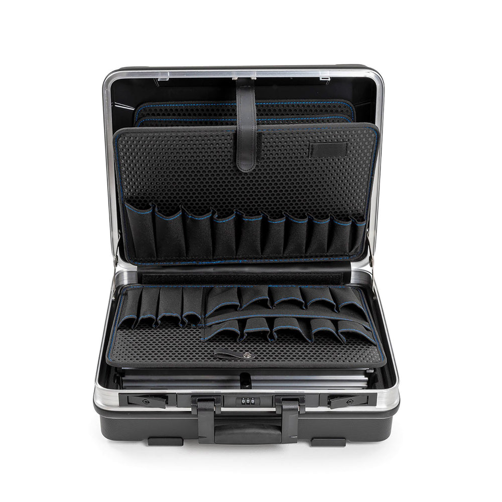 A case that really does it all: The shell, made of ultra rugged ABS plastic, withstands impacts and falls with ease. One special feature of the Base Tool Case with Pocket Boards is its four feet, which keep the case perfectly stable and prevent abrasions from uneven surfaces, preserving the case's classy, black design over the long term.