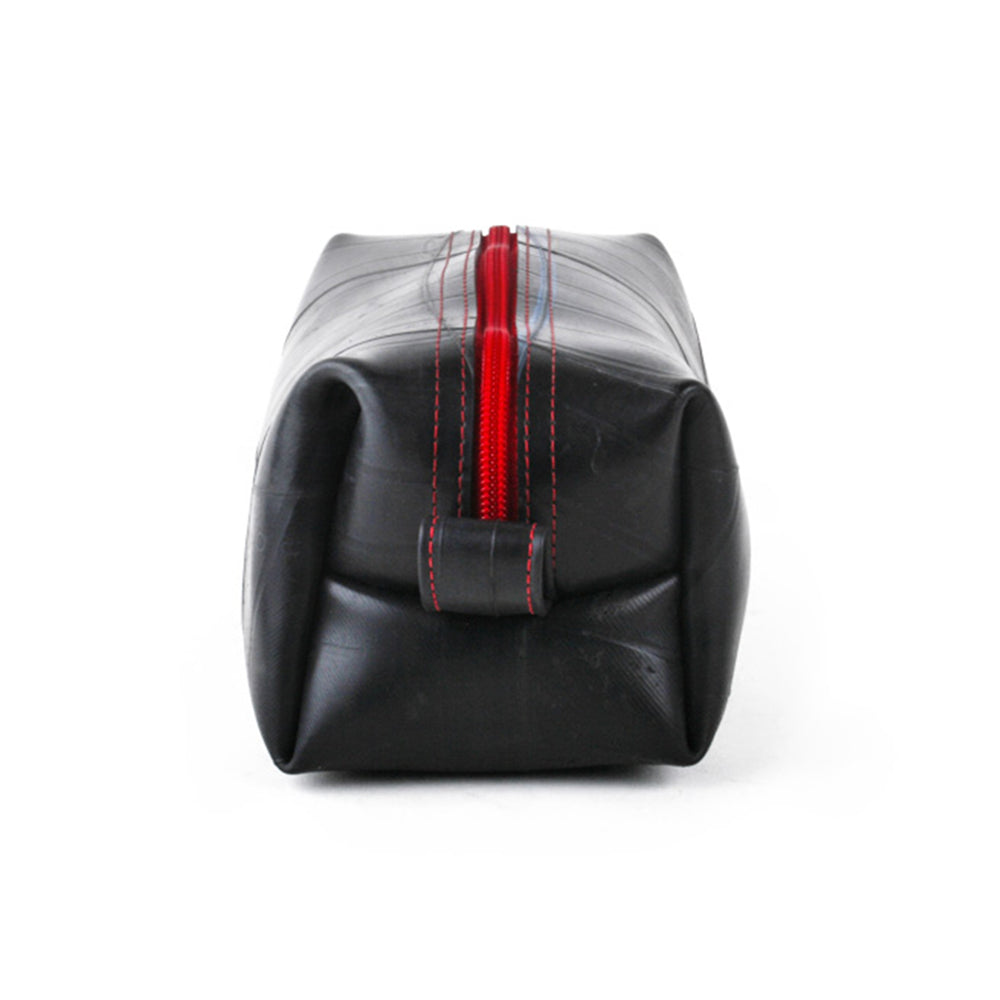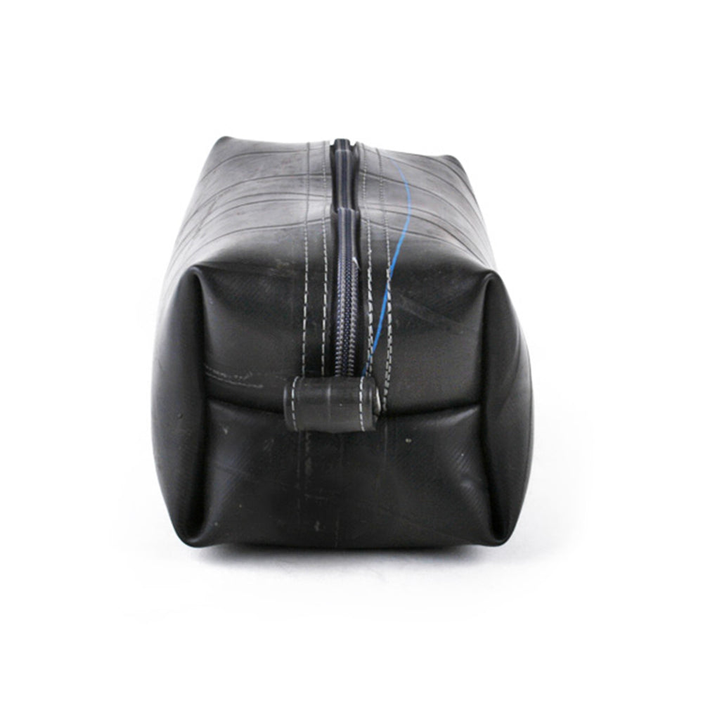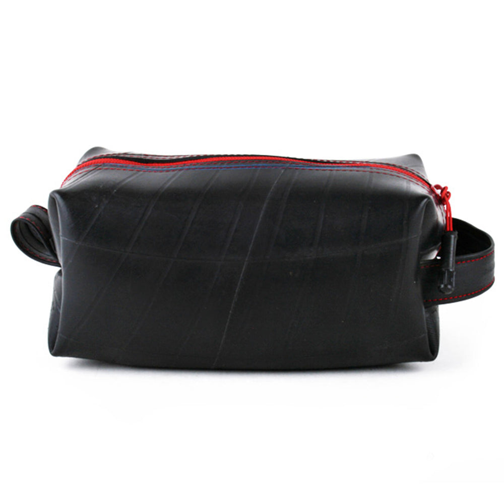 This upcycled travel companion is suitable for carrying all of your essential grooming and bath accessories. With an exterior constructed from durable reclaimed truck inner tubes, this versatile bag is highly water resistant. Features a zipper pull made from a tube valve, a full handle loop on one end and a smaller hanging loop on the other. Fully lined interior. Markings and patterns vary widely, no two are alike.