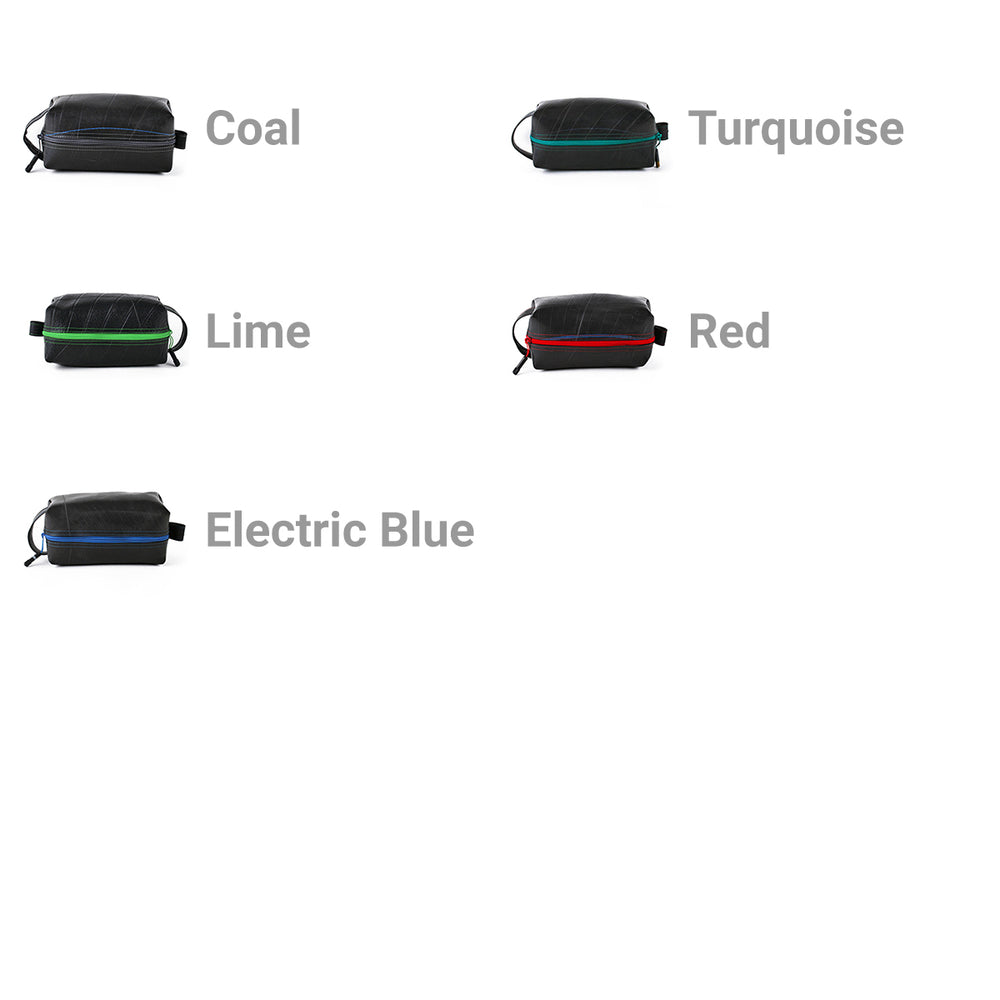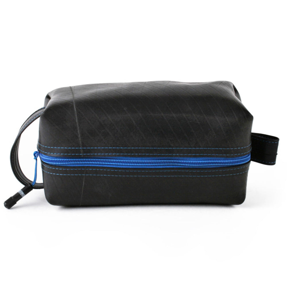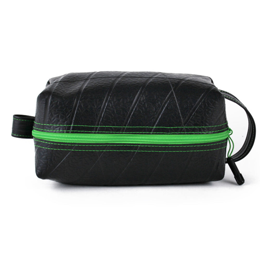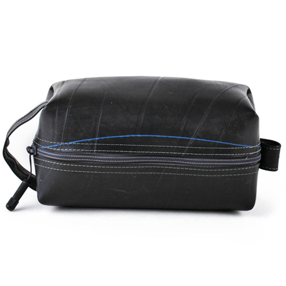 This upcycled travel companion is suitable for carrying all of your essential grooming and bath accessories. With an exterior constructed from durable reclaimed truck inner tubes, this versatile bag is highly water resistant. Features a zipper pull made from a tube valve, a full handle loop on one end and a smaller hanging loop on the other. Fully lined interior. Markings and patterns vary widely, no two are alike.
