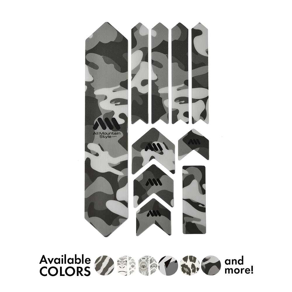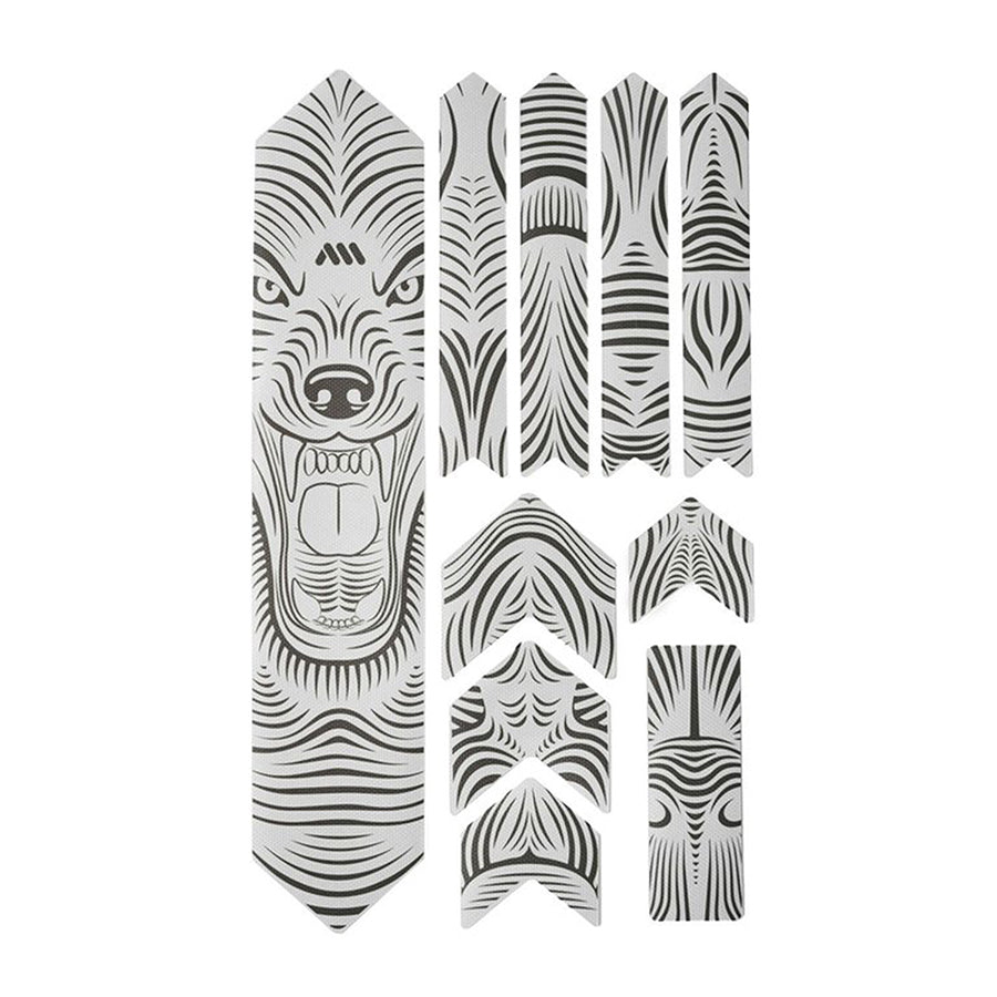 - 10 parts for a universal protection system: 1 big part for the down tube; 4 arrow parts for extending the down tube protection or top tube, 4 parts for the chainstay; 1 rectangle for cable wear protection or other uses.