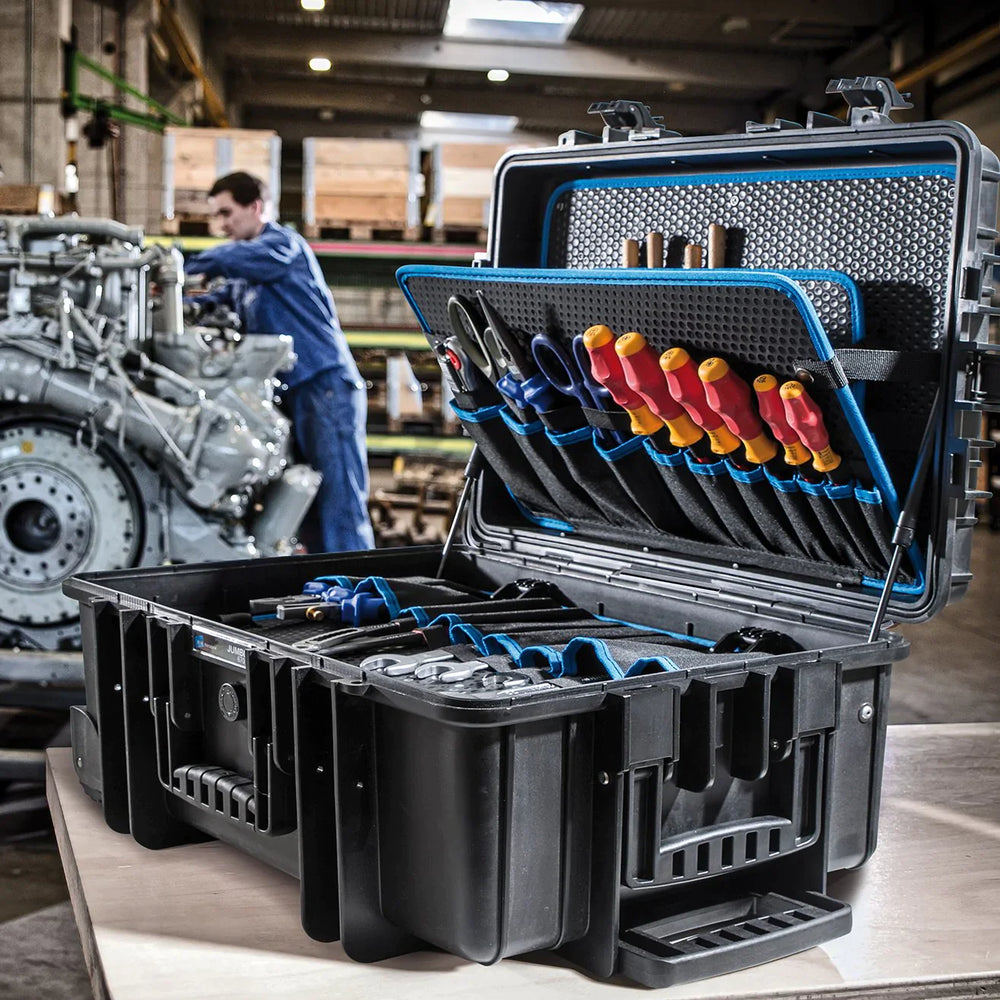 The Jumbo 6700 is the ideal companion for service technicians working around the globe. It offers extensive storage space for tools, including an additional tool board that is attached to the tool pockets with elastic loops. A gas strut on each side prevents the lid from falling for optimal access to tools. It also comes with two smooth-running casters and a telescoping handle, allowing this tool case to be transported comfortably even when fully loaded. A spacious and maneuverable companion.