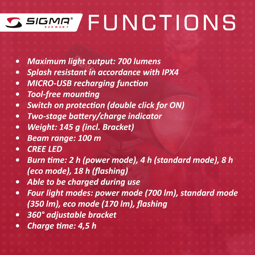 Sigma Buster 700 power light is a compact, durable and powerful choice from Sigma's Buster series for use as bike front light or a head light. This compact, yet very visible lighting solution with 700 lumen light output and 100 m visibility range, helps bikers stay visible and safe during night rides.