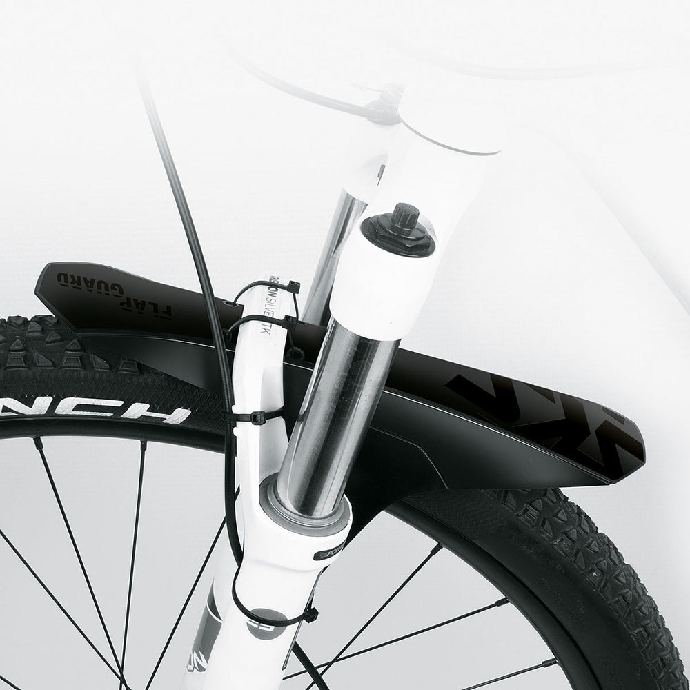 FLAP GUARD sticks close to your bike even in extremely aggressive riding due to the supplied zip ties, which wrap around the fork bridge and fork legs. Mud is kept off your fork seals. Also compatible on rear side of frame.