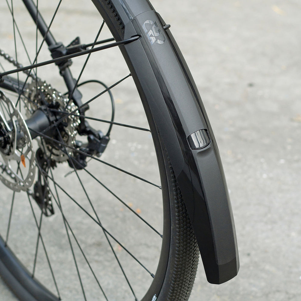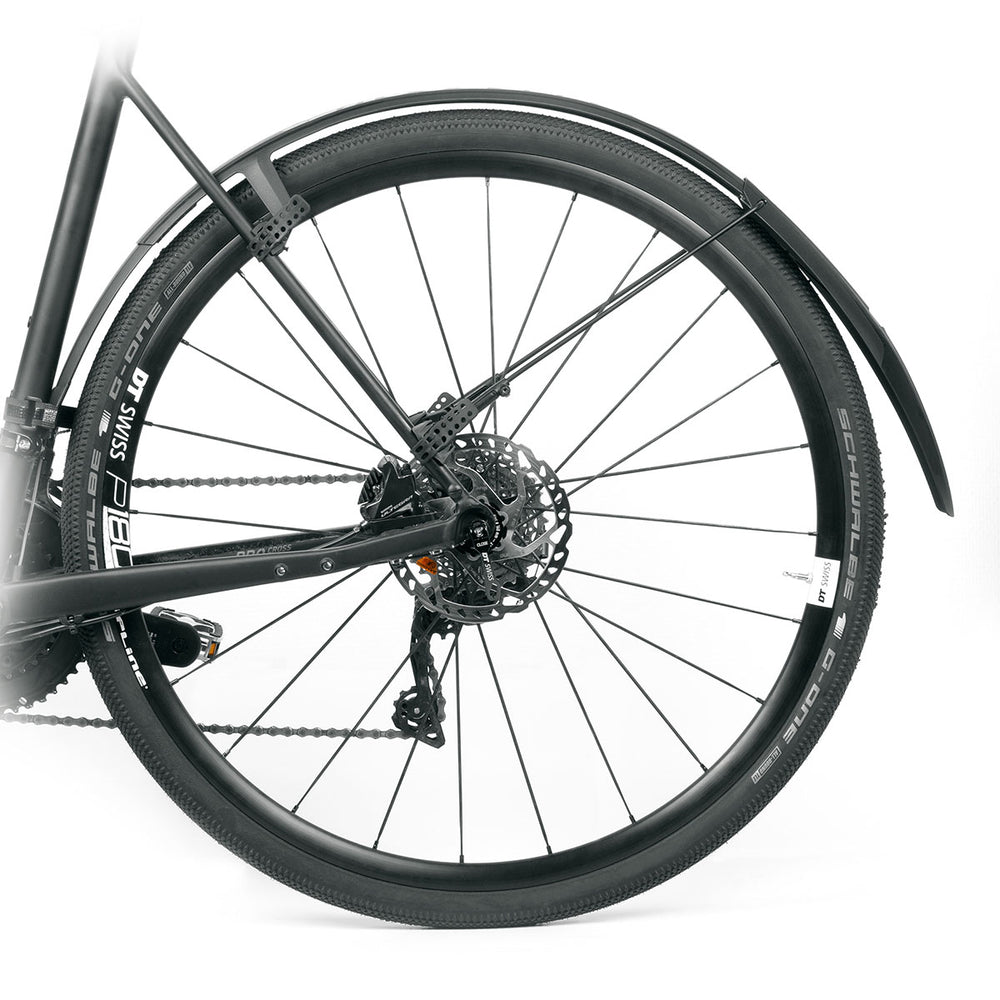 The extension made of black, impact-resistant plastic can be easily clipped onto the tried and tested SPEEDROCKER rear mudguard, thus extending it by 170 mm. It can be mounted and removed without any tools in just a few seconds. The splashing between the tyre and mudguard at the lower end also allows it to better deflect any spray water and mud. This not only protects the rider’s back but also their cycling companion from any flying dirt.