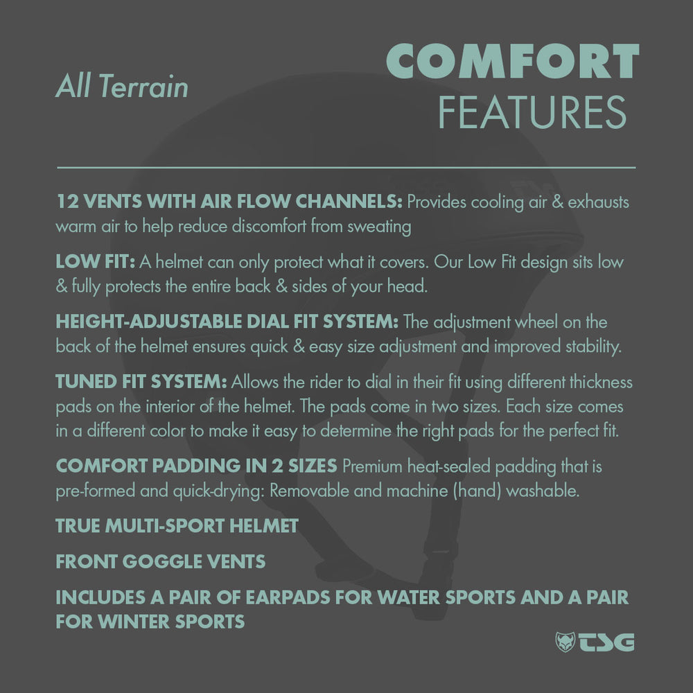 The All-Terrain is the first ever action sport helmet designed, tested and certified for all sports and all seasons. It combines the best features of bike, skate, water and winter lids in an all-singing-all-dancing full-wrap, low fitting, in-mold helmet, that is finished off with interchangeable water and winter specific ear pads. It comes in a wide range of sizes, so its lightweight versatility is accessible to all, while removable Comfort pads, TSG Dial Fit and Tuned Fit Systems make the fit fully customisable. Last but no least, 12 aerodynamic vents and Airflow channels add to the helmet’s comfort and coolness, making the All-Terrain the go-to head protection wherever and whenever you ride.