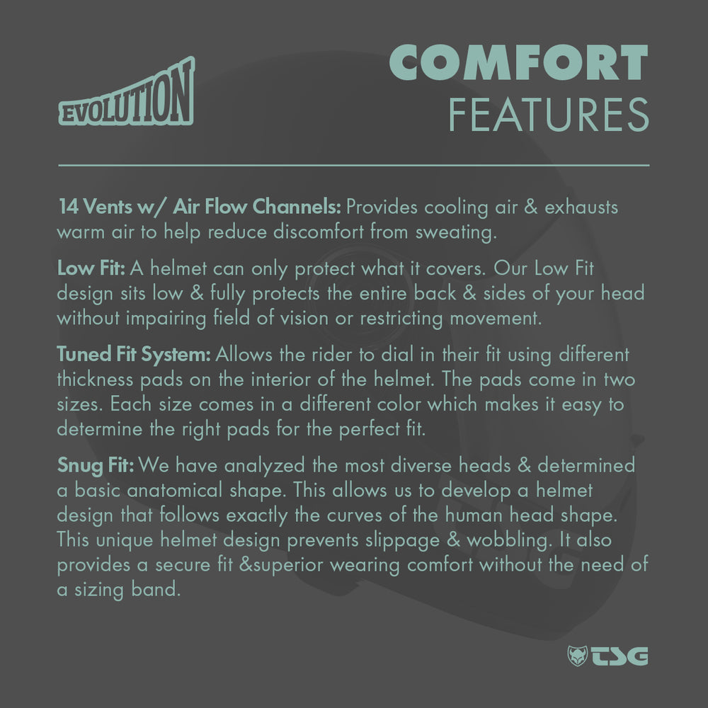 SNUG FIT: The Evolution helmet features the Snug Fit technology, which is designed to follow exactly the curves of the human head shape and achieve a so-called contact ring in the helmet, allowing the head to touch the helmet all around. his provides a wobble-free experience during jumps and other tricks. The helmet also comes with two sizes of pads to adjust your size.