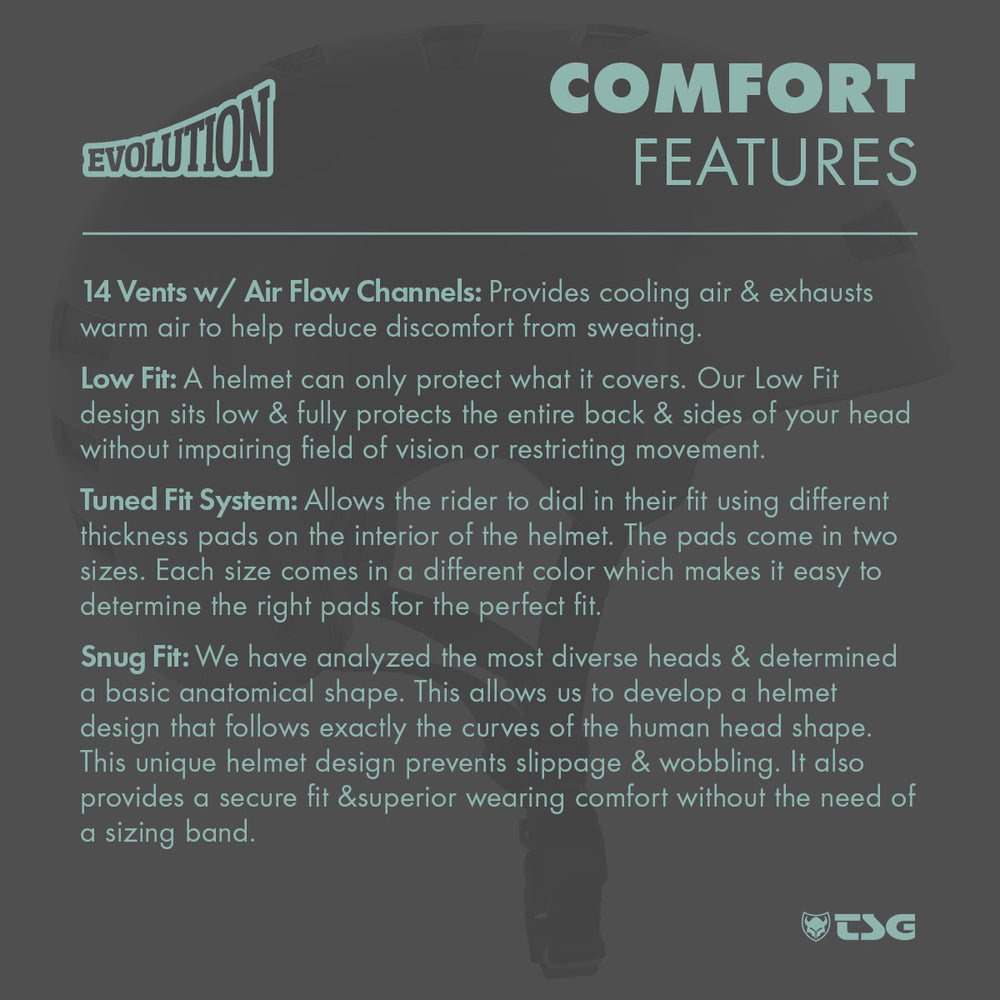 - TUNED FIT SYSTEM: TSG's Tuned Fit System allows a rider to adjust their fit using different thickness comfort pads on the interior of the helmet. Helmets come with two sizes of comfort pads.