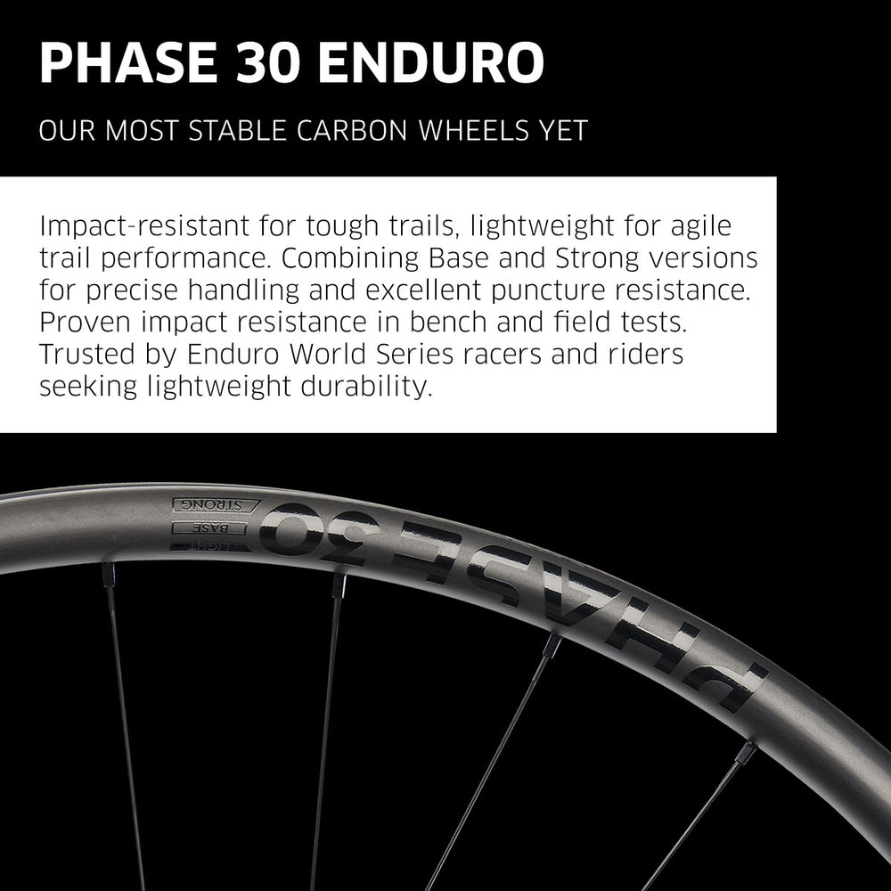 Impact-resistant enough to withstand the nastiest rock gardens on enduro trails and tough bike park use. But at the same time light enough to catapult you agilely over the trails. With the Phase 30 Enduro, we are fulfilling this dream for enduro bikers. We combine the Phase 30 Base version on the front wheel with the almost indestructible Phase 30 Strong version on the rear wheel. The result is a perfectly matched duo that combines precise handling with impressive puncture resistance on the trail. The flat rim profile ensures optimum comfort and grip to hit your line. At the same time, the new Phase 30 Strong rim shines with first-class impact resistance - as proven by our many bench and field tests. That's why the Phase 30 Enduro is not only the first choice for racers in the Enduro World Series, but also for modern Enduro riders who prefer lightweight material without compromise.