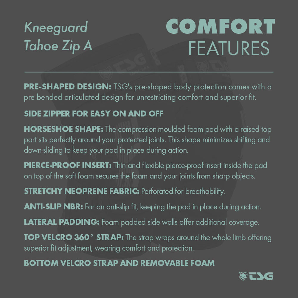 The Kneeguard Tahoe Zip A is TSG’s brand new edition of a tried and tested essential piece of bike protection. The pad sleeve, which has a vertical zip to make it easier to get fit and wear, is made from supportive stretchy neoprene fabric and is secured by a top Velcro 360° strap and bottom Velcro strap to keep the horseshoe shaped knee shield in place.