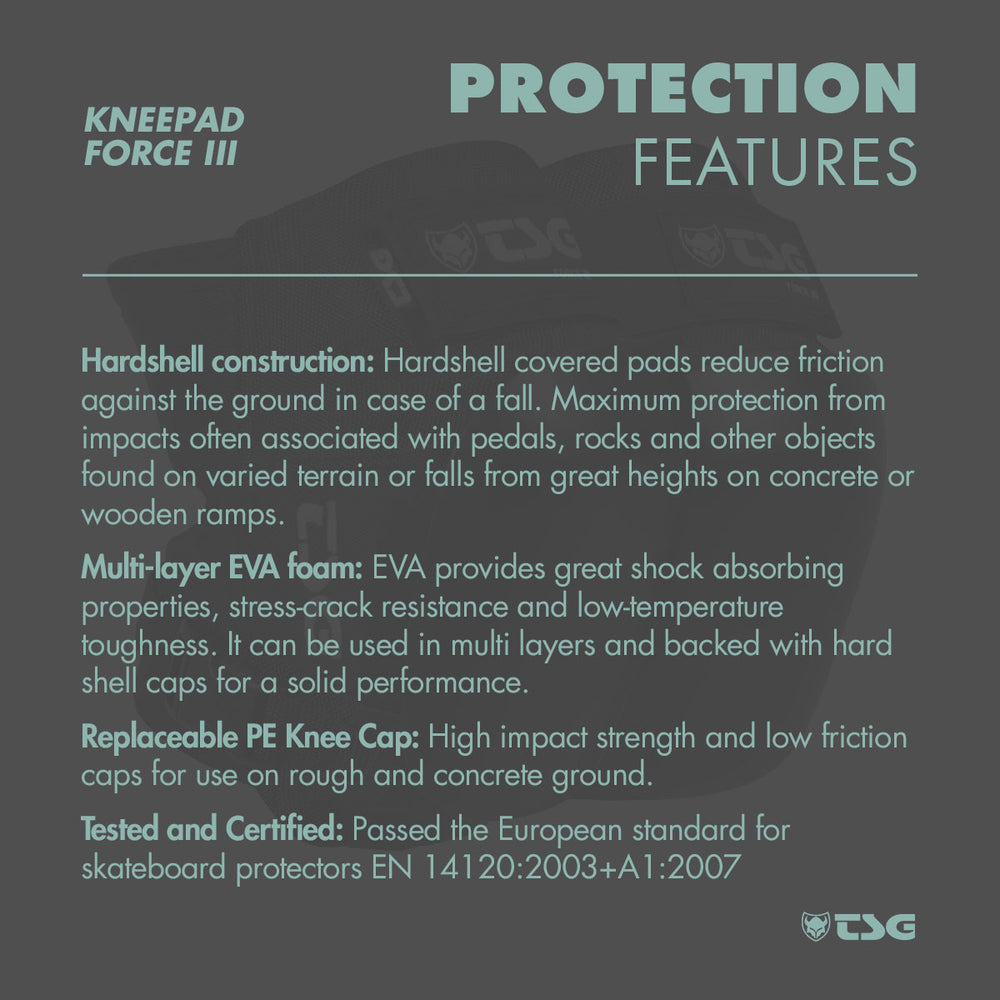 TSG kneepads offer incredible quality surpassing international safety standards such as EN 14120:2003+A1:2007 Level 2 - European standard for skateboard protectors. Designed in Switzerland, TSG products are tested by a passionate internal team of riders and certified by independent lab testing.
