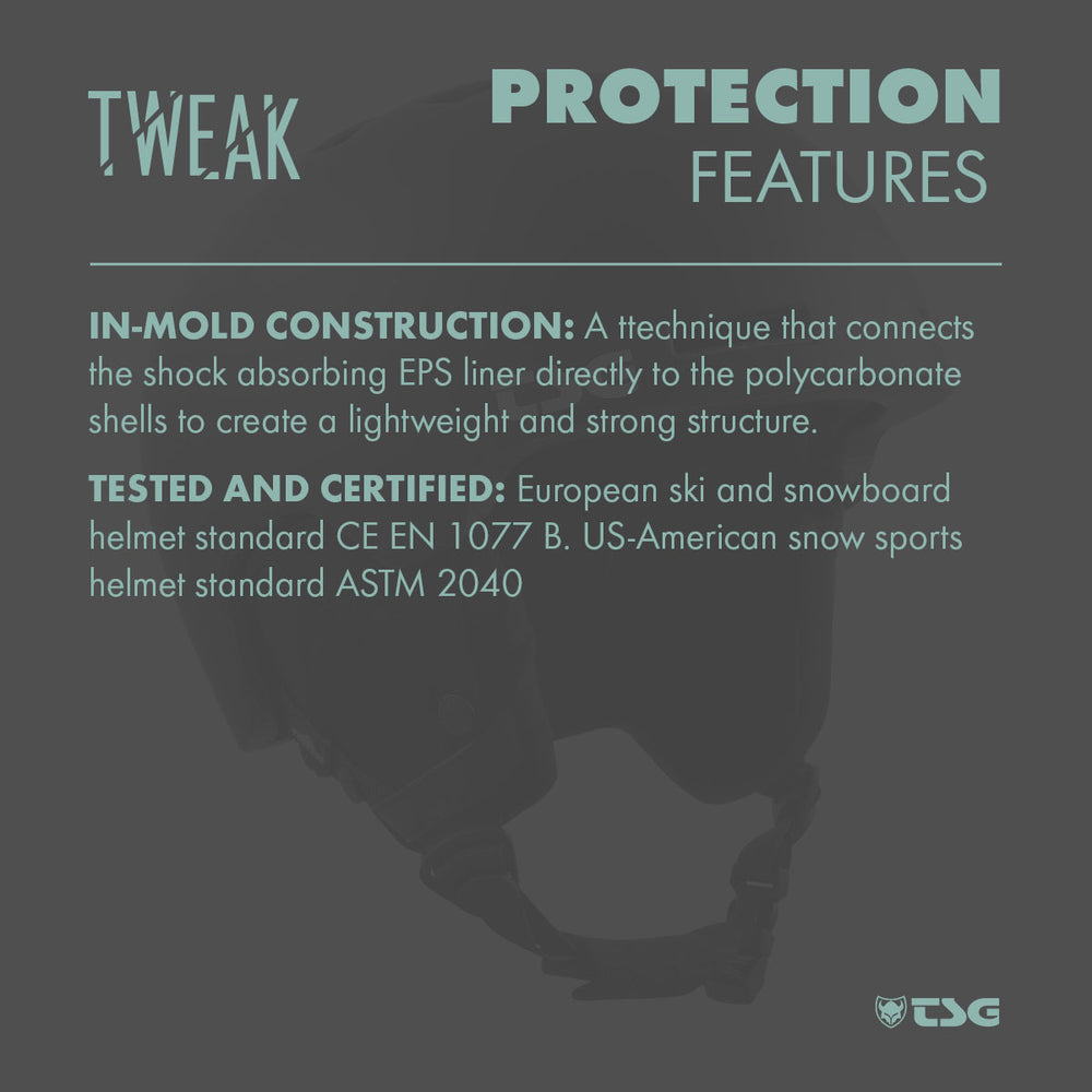 MAXIMUM PROTECTION: TSG Tweak helmet is made with lightweight, in-mold construction, which is a technique that connects the shock absorbing EPS liner directly to the polycarbonate shells to create a lightweight and strong structure. A protective layer of PC is bonded to the front foam for a clean look and additional strength in the helmet’s bottom rim.