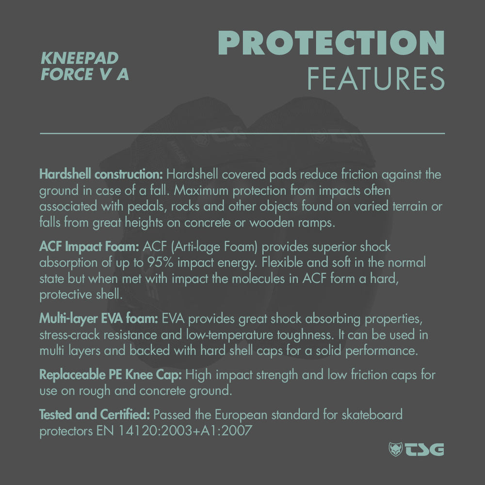 TSG Force V A knee pads offer incredible knee protection, for pros in roller derby, Downhill, BMX, and skateboarding. Skaters can focus on their performance without worrying about the cuts and scrapes. Athletes will enjoy stress relief from the extra reinforcement at critical pressure points. Comfortable fabric lining adds to all-day wearing comfort.