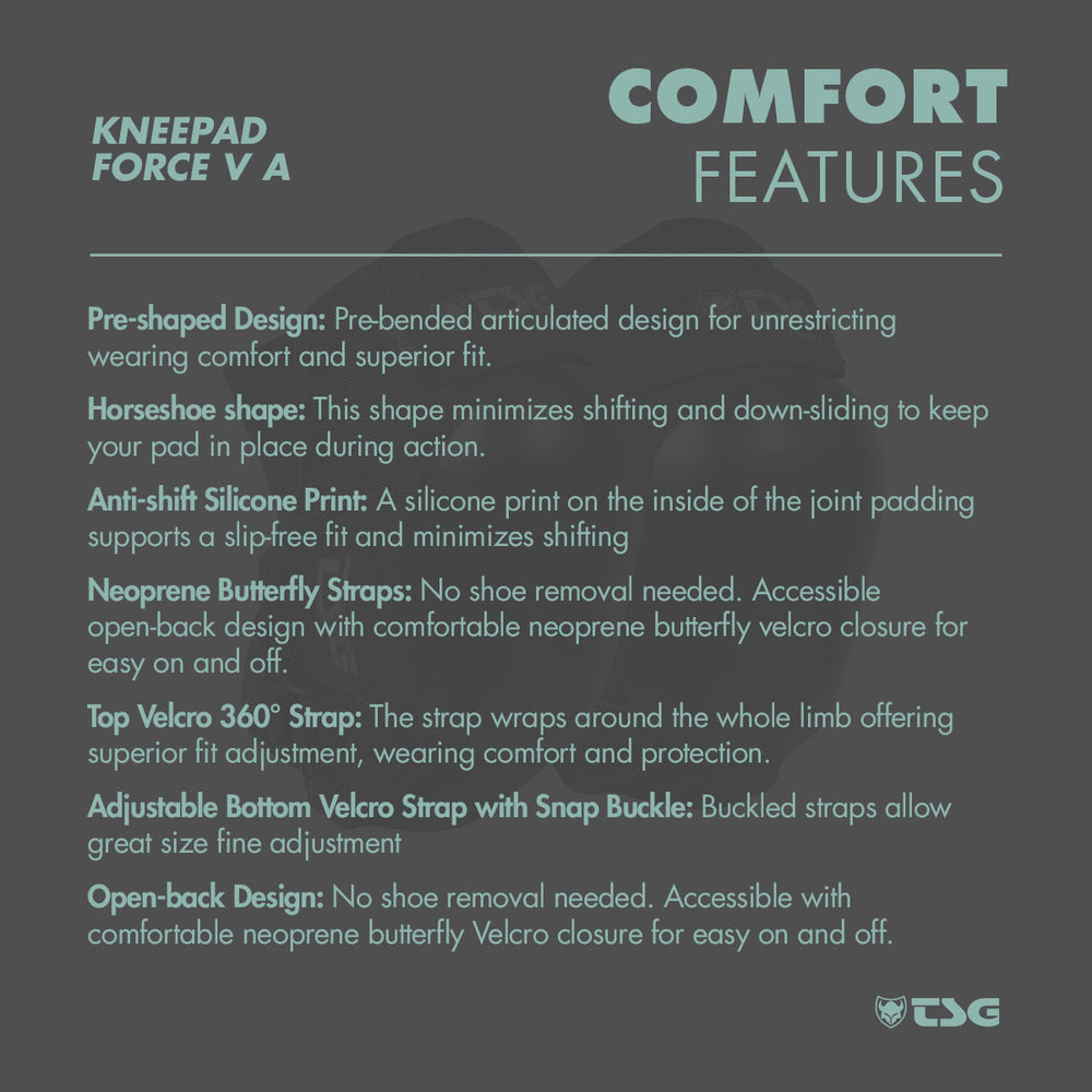 TSG Force V A knee pads offer incredible knee protection, for pros in roller derby, Downhill, BMX, and skateboarding. Skaters can focus on their performance without worrying about the cuts and scrapes. Athletes will enjoy stress relief from the extra reinforcement at critical pressure points. Comfortable fabric lining adds to all-day wearing comfort.
